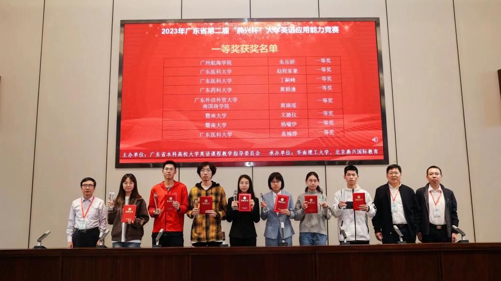 2023年12月2日至3日,2023年广东省第二届“燕兴杯”大学英语应用能力竞赛在华南理工大学举行,公司选手朱乐妍(指导老师陈文江)荣获一等奖, 刘鸿翔(指导老师吴宾凤)、汪文涛(指导老师吴雪红)获得二等奖,李松霖(指导老师朱慧华)、周成颖(指导老师李冬梅)、周吉宏(指导老师胡浪多)获得三等奖。