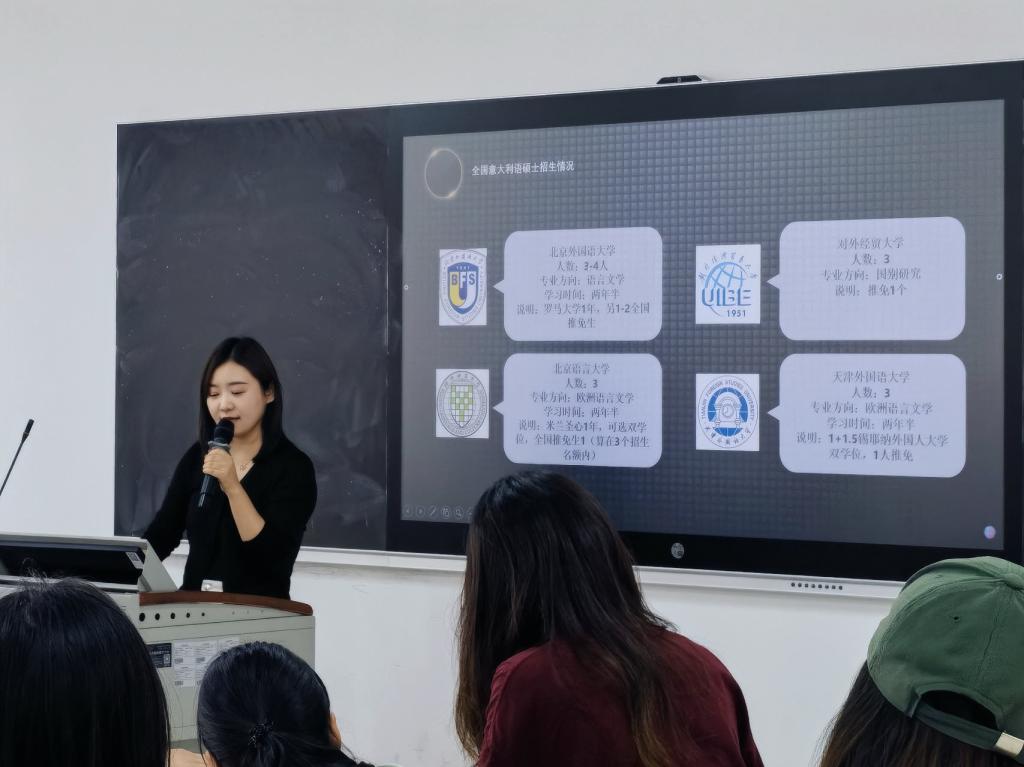 3月28日下午在文理楼406,外语公司意大利语系冯烨副教授和黎星宏老师为意大利语专业的同学们带来了一场干货满满、全面细致的国内外考研、升学讲座,讲座由意大利语系主任杜钰萱主持,外语公司副经理谭晖、副书记陈文宇以及意大利语专业全体同学都参加此次讲座。
