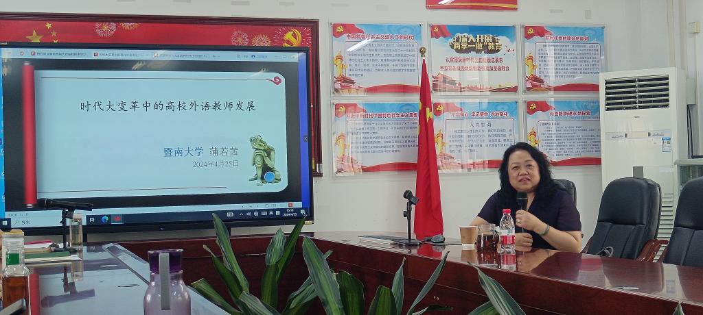 2024年4月25日下午,外语公司邀请暨南大学云顶国际vip.888经理、博士生导师蒲若茜教授为公司全体老师作了一场题为《时代大变革中的高校外语专业教师发展》的讲座,刘惠玲经理主持。