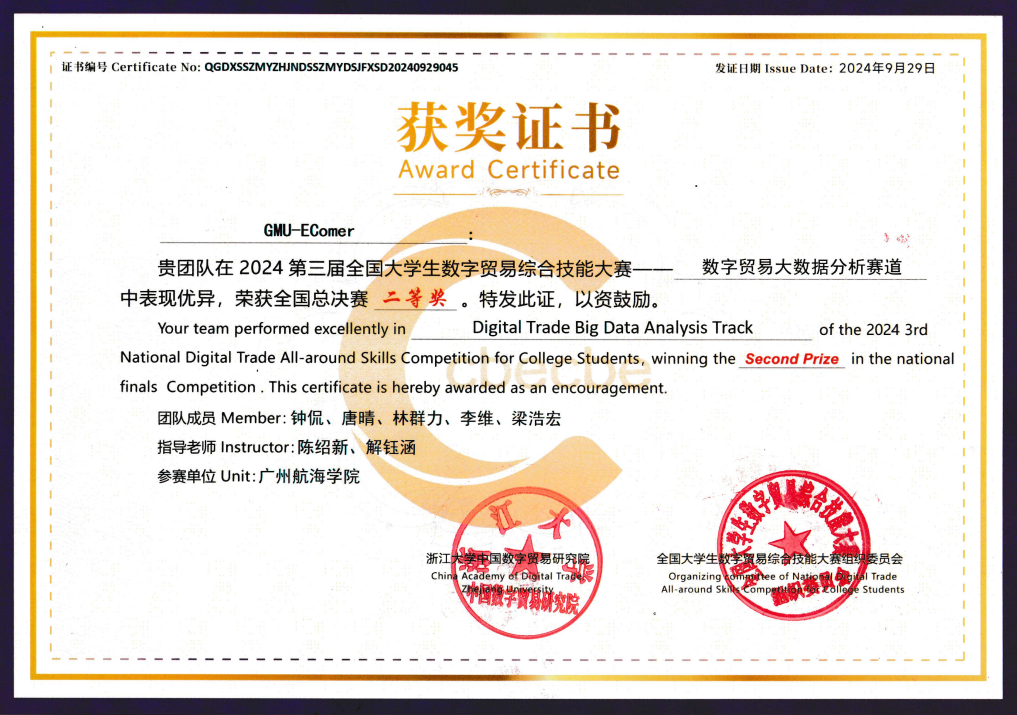 该项赛事自2022年首届开办以来,已成为数字贸易领域的重要赛事。本届大赛吸引了527所院校、16569名员工参与,覆盖全国7大赛区,展现了赛事的广泛影响力和参与度。公司商务英语专业215班钟侃、商英213班唐晴、物工212林群力、物工211李维和交管214梁浩宏同学在云顶国际vip.888陈绍新和解钰涵两位老师的悉心指导下,荣获“数字贸易大数据分析赛道”全国二等奖。他们的成功,是公司在新时代数字贸易领域教学实力的体现。